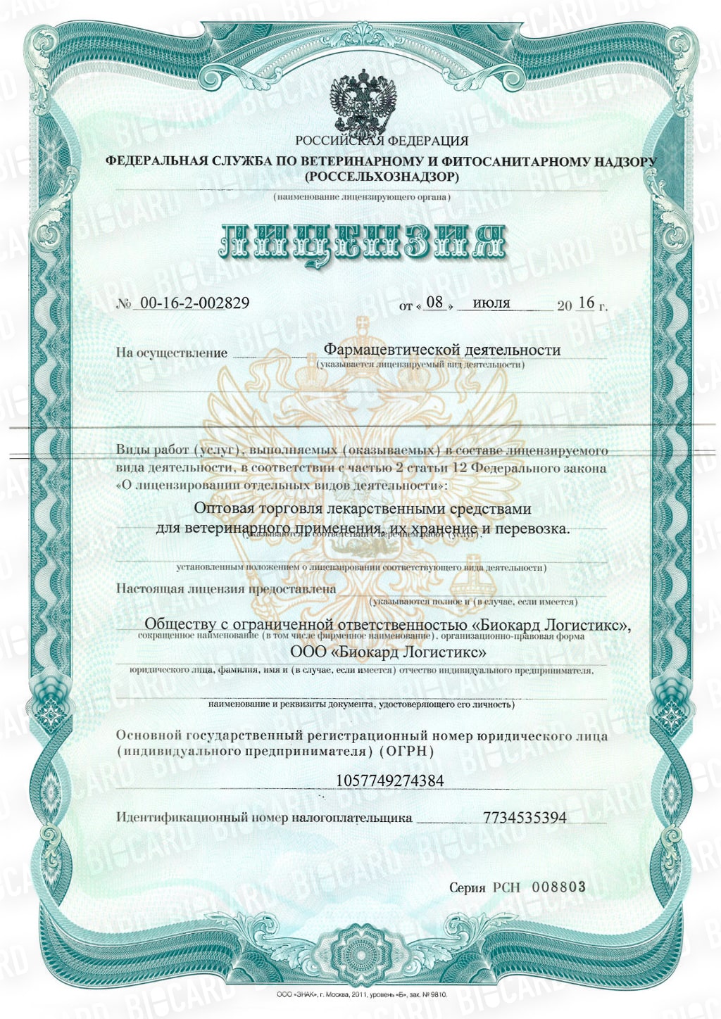 Компания BIOCARD оказывает полный комплекс логистических услуг в сфере здравоохранения. Для осуществления такой широкой деятельности, не обойтись без специальных документов.
